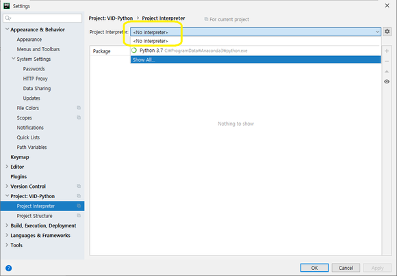 이후에 PyCharm에 들어가보니, 역시 Executable이 없다.
