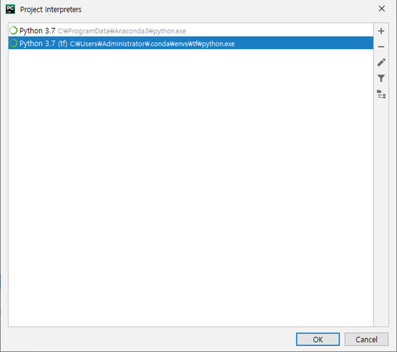 tf 가상 환경에 설치된 패키지까지 주르륵 뜬다.