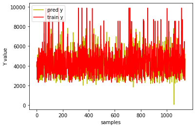 show_diff(pre_test_y, 'pred y', y_train, 'train y', 'samples', 'Y value')