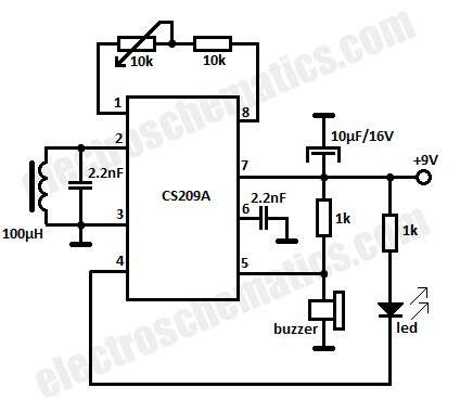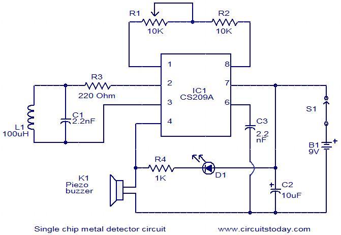 This is a simple single chip metal detector circuit based on IC CS209A from the Cherry Semiconductors. A 100uH coil is used to sense the presence of metal. The IC CS209A has a built in oscillator circuit and the coil L1 forms a part of its external LC circuit which determines the frequency of oscillation. The inductance of the coil change in the presence of metals and the resultant change in oscillation is demodulated to create an alarm. The LED gives a visual indication too. This circuit can sense metals up to a distance of few inches.