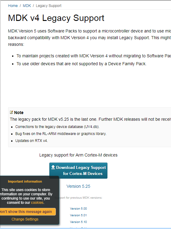 Note The legacy pack for MDK v5.25 is the last one. Further MDK releases will not be receive a legacy pack update. This means that there will be no: Corrections to the legacy device database (UV4.db). Bug fixes on the RL-ARM middleware or graphics library. Updates on RTX v4. Legacy support for Arm C...