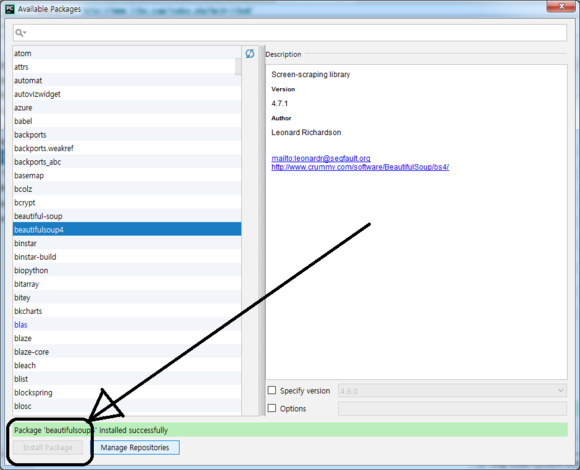 BeautifulSoup4 선택하고, "Install Package" 클릭