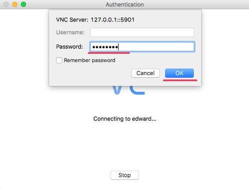 Connect to the VNC server and you will be asked for the VNC server password. Type your password and click ‘OK’.