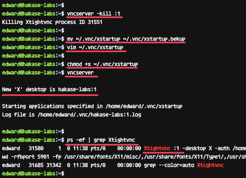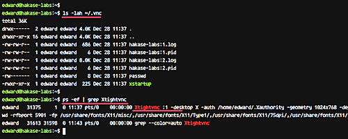 ls -lah ~/.vnc/ ps -ef | grep Xtightvnc |