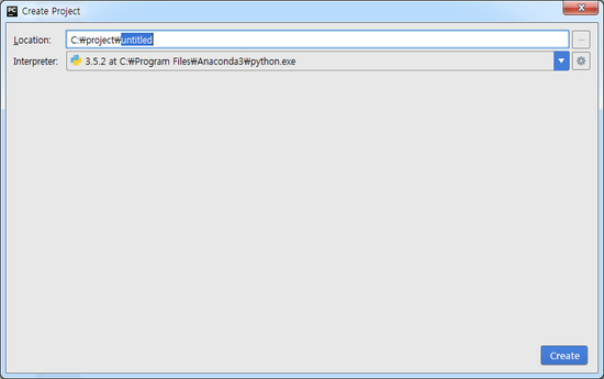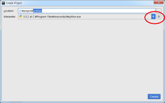 ③ 프로젝트 저장 위치 선택 후 Interpreter 항목에서 TensorFlow 설치된 환경의 Python 선택 필요 (최초 1번 추가 필요)
