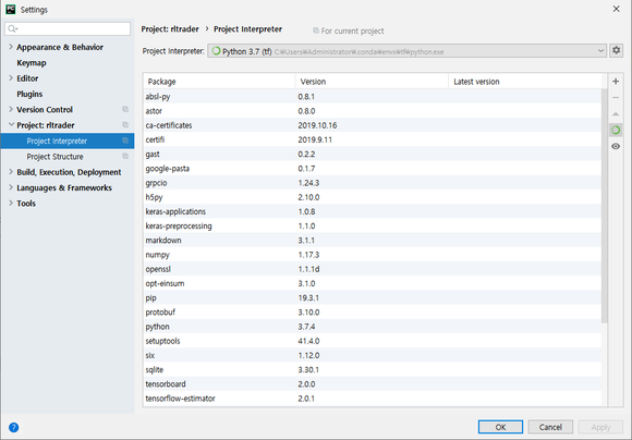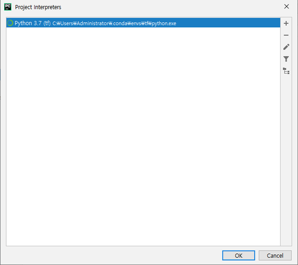 이제 PyCharm에 Anaconda 환경에 설치한 tensorflow를 연결하겠습니다.