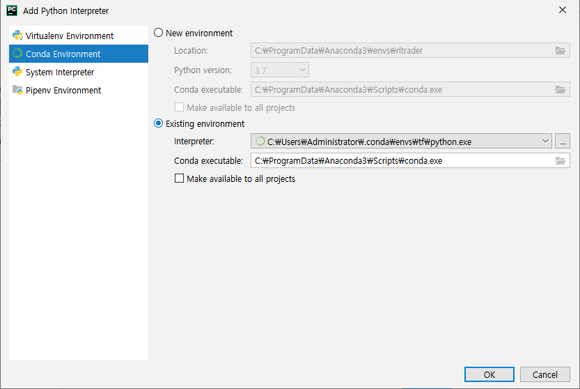 여기서 좌측의 'Conda Environment' 클릭.